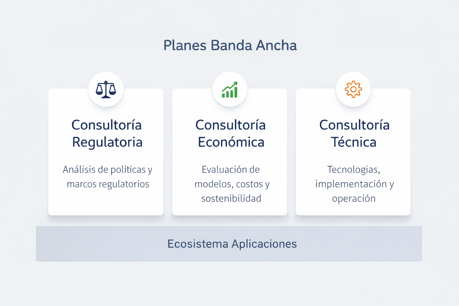 Pensamos que a través de este modelo de servicio las instituciones públicas, los organismos multilaterales y los entes privados encontrarán las claves para resolver los retos estratégicos que plantea el desarrollo de este ecosistema. Las prácticas son: Planes de Banda Ancha, Ciberseguridad, Ecosistema de Aplicaciones, Consultoría Regulatoria, Consultoría Técnica y Consultoría Económica.